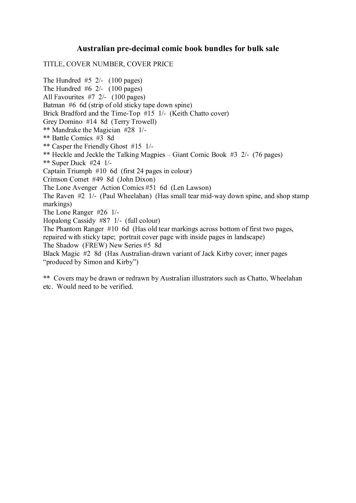 Please note these comics are not available separately as singles - they are all included as a batch. Also, for the time being, please refrain from enquiring about any other comics not listed here. Thanks!